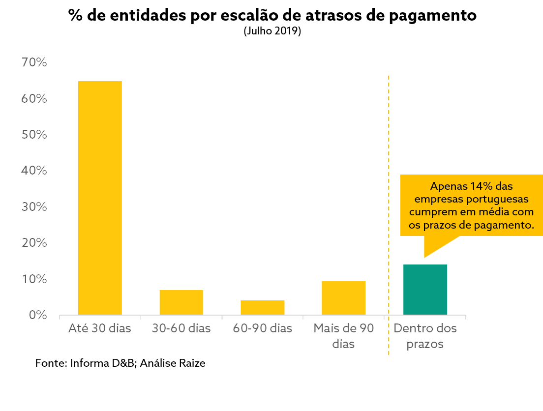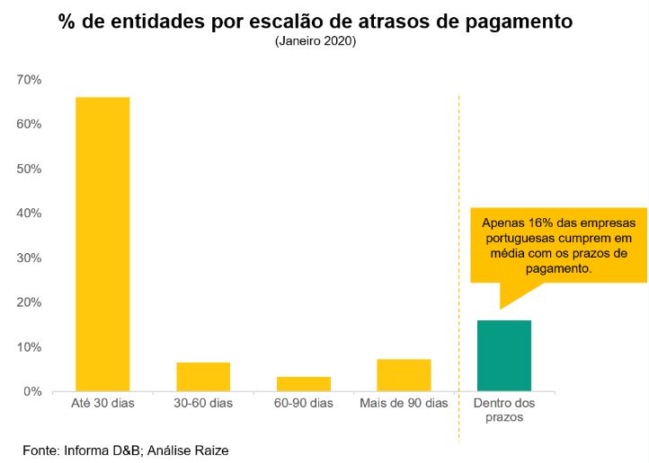 Segundo dados de um estudo da Informa D&B, grande parte das empresas portuguesas paga com um atraso médio de 30 dias, sendo que apenas 16% cumprem em média com os prazos. Segundo o mesmo estudo, Portugal é, em todo o mundo, um dos países onde menos empresas cumprem os prazos de pagamentos acordados com os seus fornecedores.